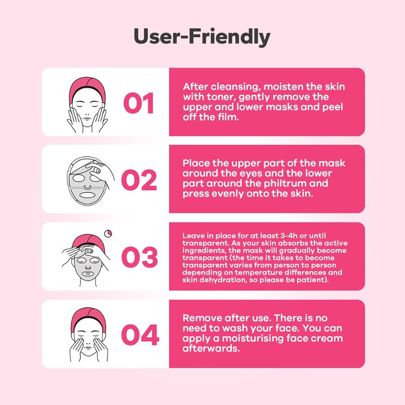 Step 1: After cleansing, moisten the skin with toner, gently remove the upper and lower masks and peel off the film. Step 2: Place the upper part of the mask around the eyes and the lower part around the philtrum and press evenly onto the skin. Step 3: Leave in place for at least 3-4 hours or until transparent. As your skin absorbs the active ingredients, the mask will gradually become transparent (the time it takes to become transparent varies from person to person depending on temperature differences and skin dehydration, so please be patient). Step 4: Remove after use. There is no need to wash your face. You can apply a moisturising face cream afterwards.