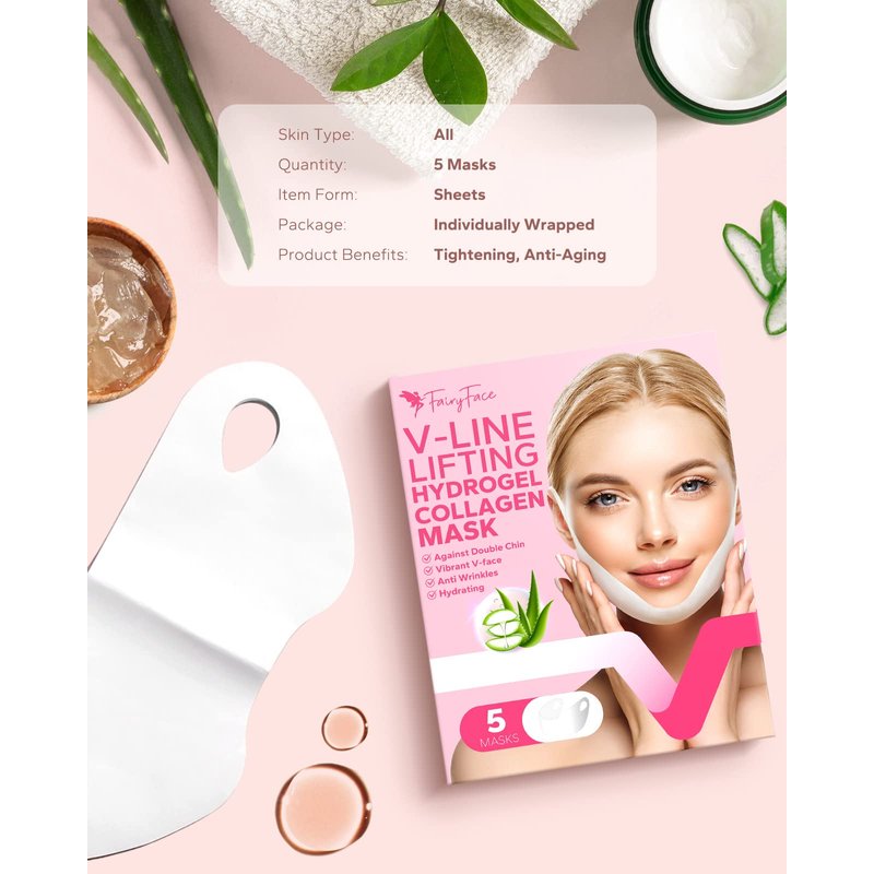 FairyFace V Line Shaping Face Masks (5 Count), Double Chin Reducer, Lifting Hydrogel Collagen Mask with Aloe Vera and Seaweed, Anti-Aging and Anti-Wrinkle