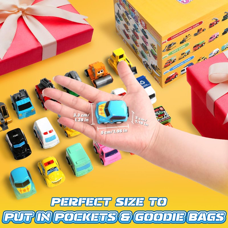 - đăPerfect Toddler GiftăThese cars toys is not only a perfect prize for kids, goodie bag and pinata stuffer because of its bright colors, cute shape and mini size, but also a perfect choice for cake decorations, party supplies, treasure box toys for classroom, and Christmas gifts for 2 3 4 5 6 years old boys and girls! WARNING: Small parts included in the product, children under 3 years old should be under supervision to play.