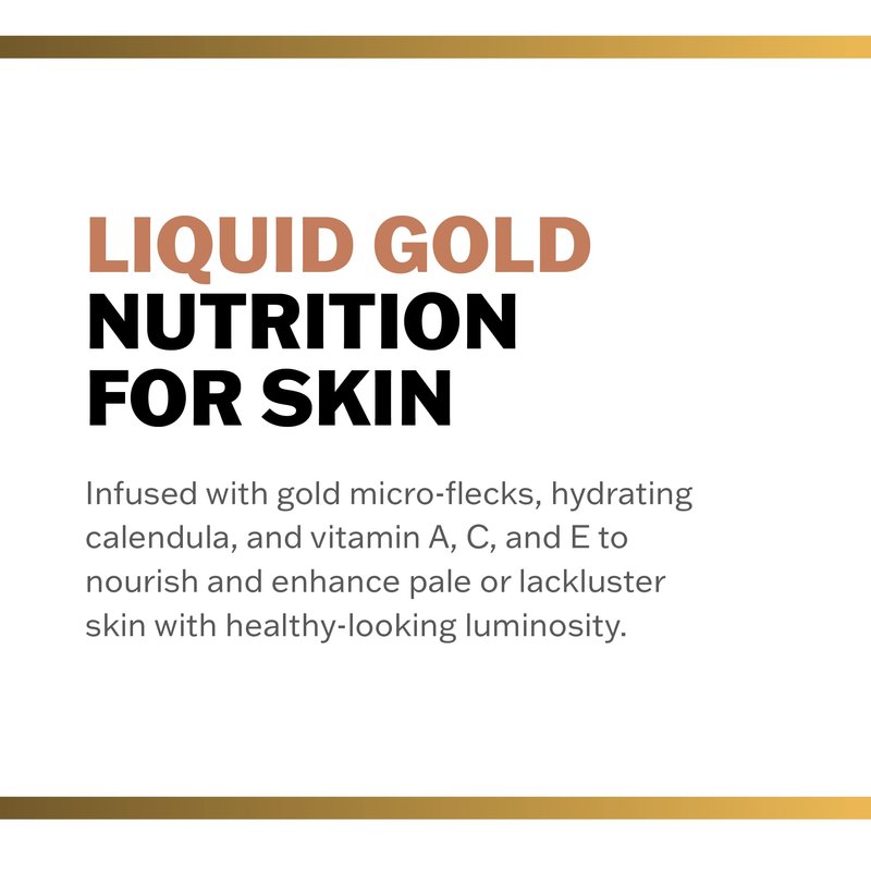 - LIQUID GOLD NUTRITION FOR SKIN - Infused with gold micro-flecks, hydrating calendula, and vitamin A, C, and E to nourish and enhance pale or lackluster skin with healthy-looking luminosity.