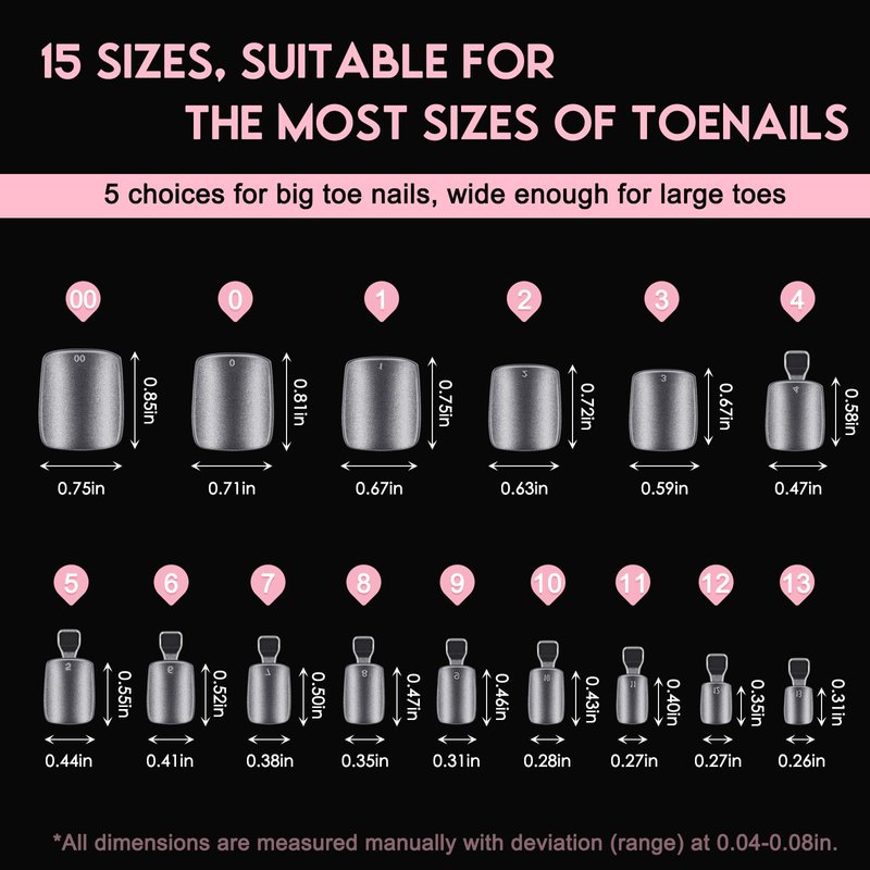 - Extensive Size Range: Our box of gel toenail extension tips contains 20 pieces of 15 different sizes, giving you a total of 300 pieces to work with. Suitable for both professional manicurists and beginners alike, these tips are the perfect addition to your nail care routine