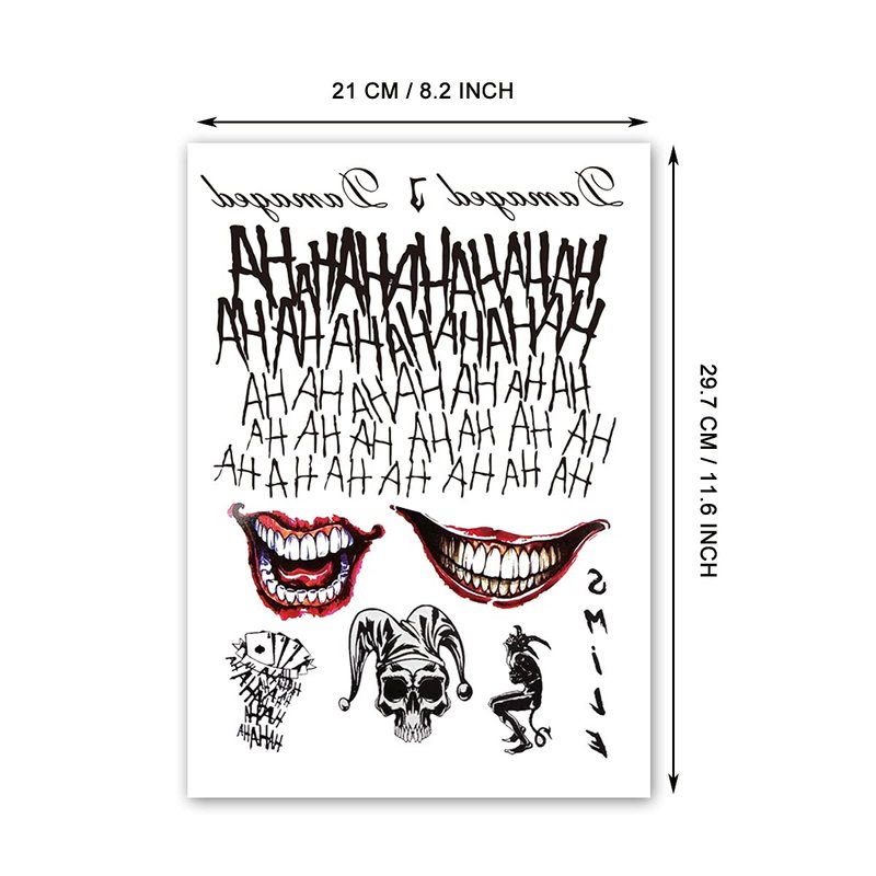 Description of Leoars Temporary Tattoos Halloween *Our halloween temporary tattoos are printed using high quality water transfer paper which are non toxic and are 100% cosmetically skin safe. *The temporary body tattoos can be placed anywhere on your hands, arms, face, neck, shoulders, chest, back, ankles, feet, legs, fingers, knuckles.