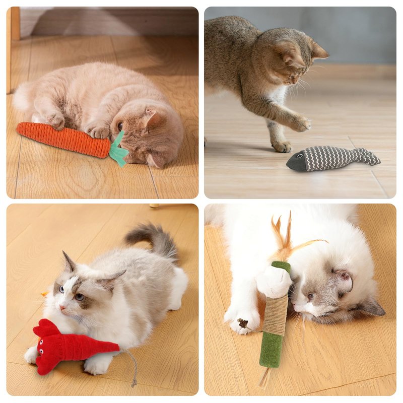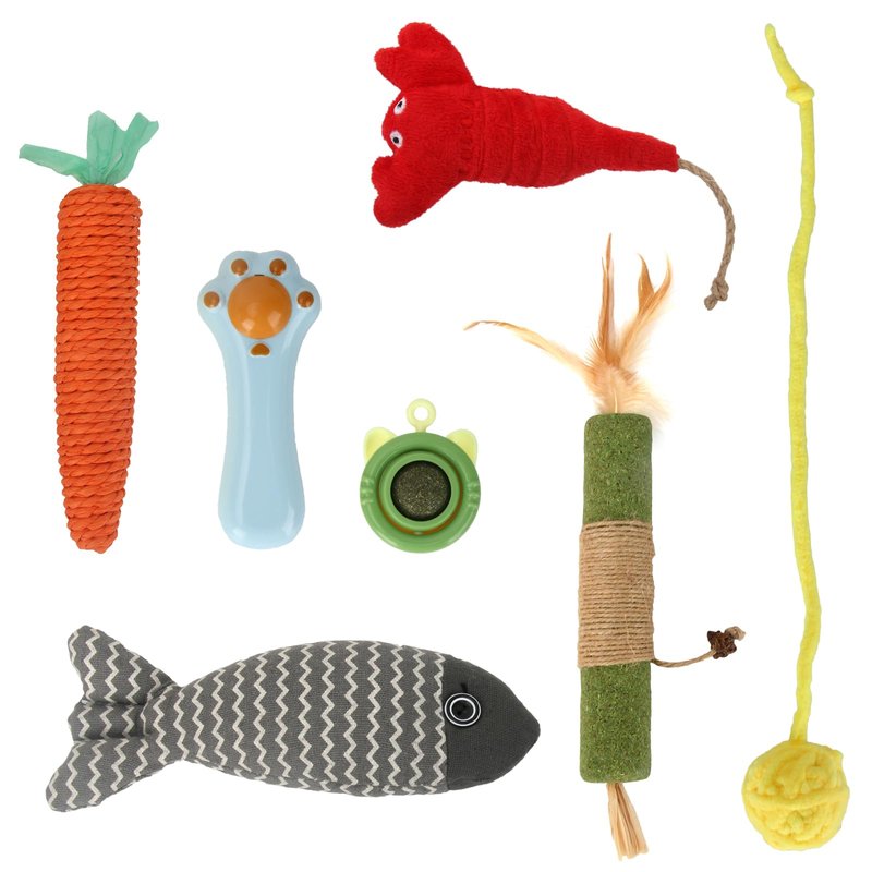 - 7 PCS Value Pack Cat Toys : 7 pieces cat toys with a Catnip Fish Toys, Carrot Cat Toys for Chewing, Catnip Toys Balls, Catnip Sticks, Cat Comb Massage, Catnip Cat Plush Toy Lobster and etc.This variety pack toys fits all cats needs,keep your cat interesting.Best Holiday and birthday gift for your cats.