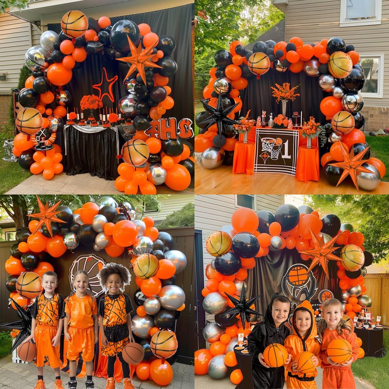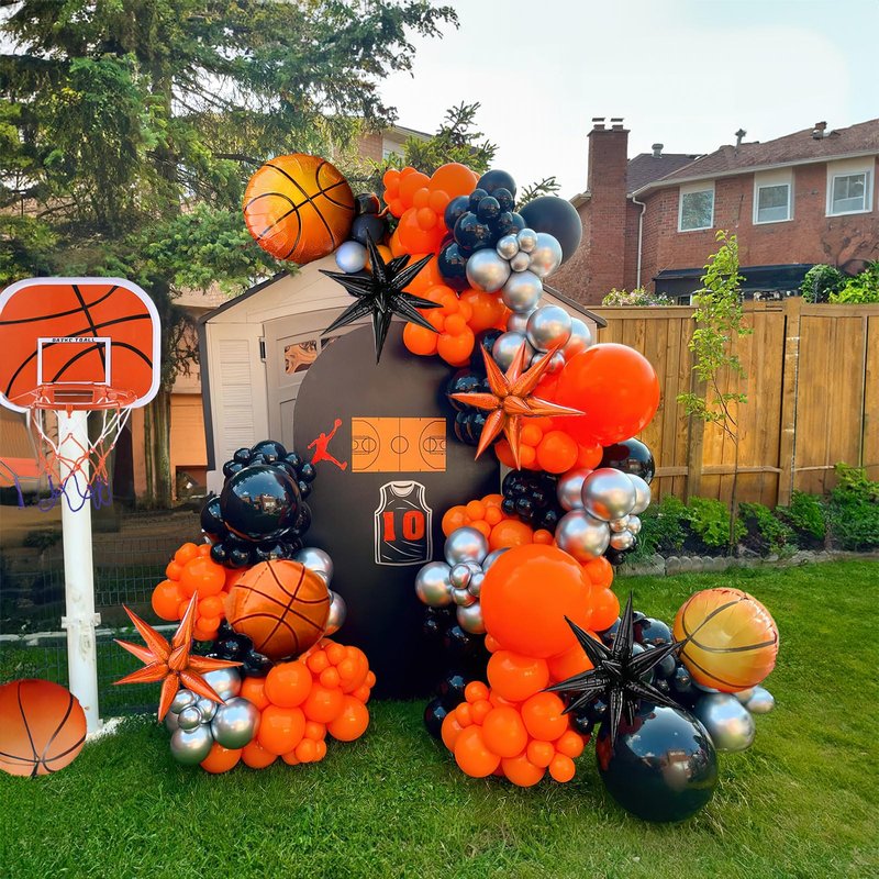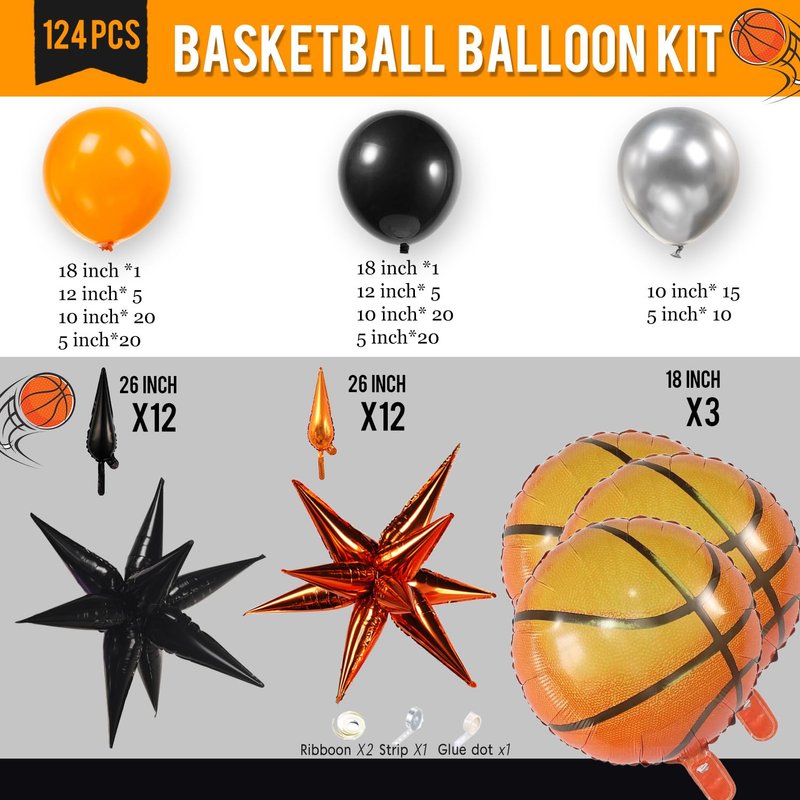 Fall Balloon Garland Arch Kit, 124pcs Orange Black silver with mylar Foil Star Basketball Balloons for 1st Birthday Party Baby Shower Sports Basketball Theme Supplies Decorations