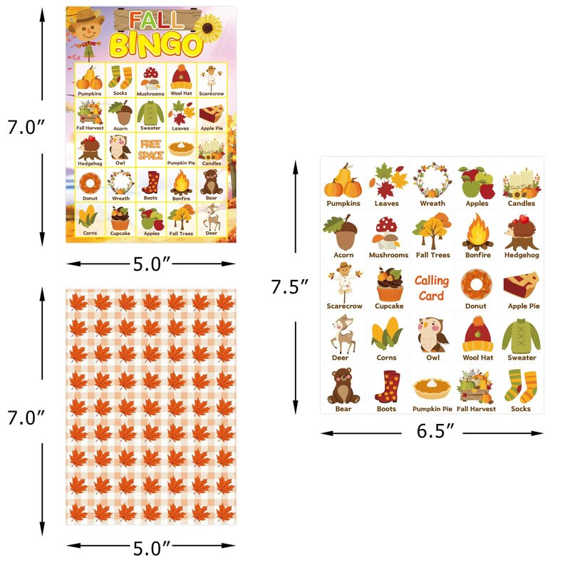 - Package Includes: 24 Fall Bingo Game Cards, 441 Leaves Bingo Card Chips, 24 call out cards; 7 x 5 1/5 inches player cards; Easily cut along dotted lines of chips sheets and calling card sheet