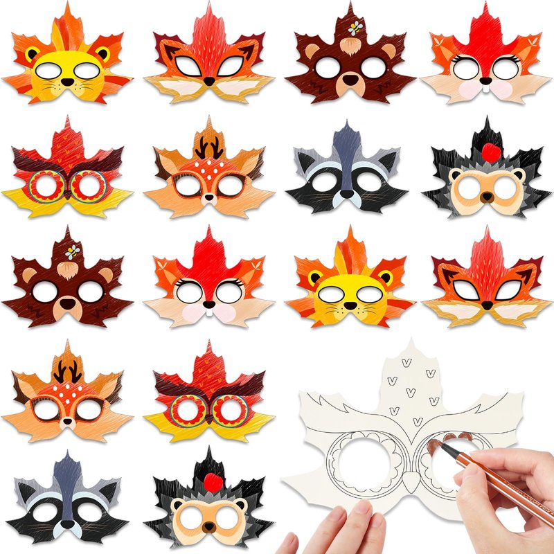 24 Pcs fall craft kits autumn maple leaf diy mask color your own animal mask diy graffiti blank painting paper mask kids harvest thanksgiving halloween craft for home class coloring game activities