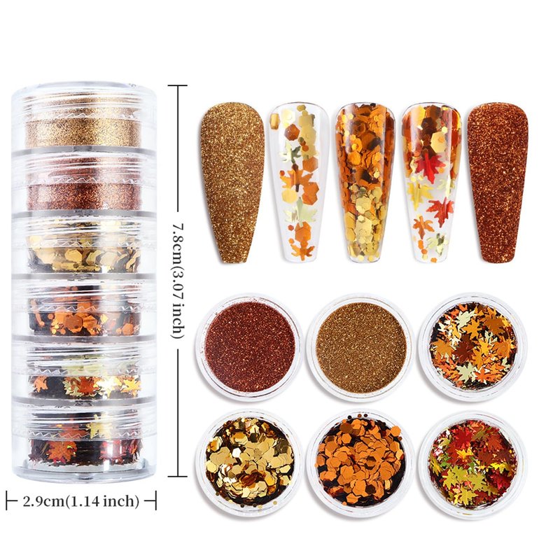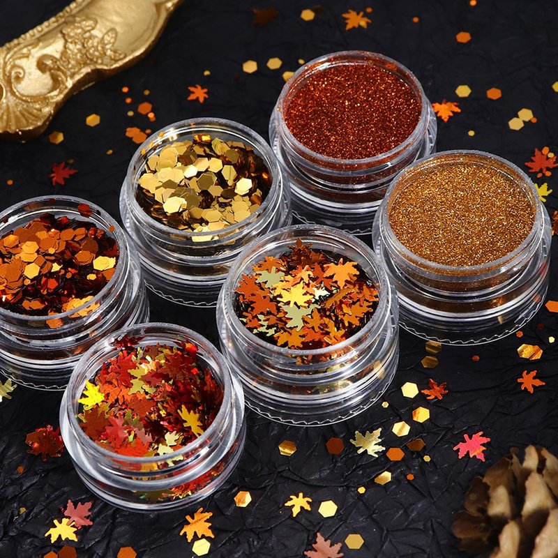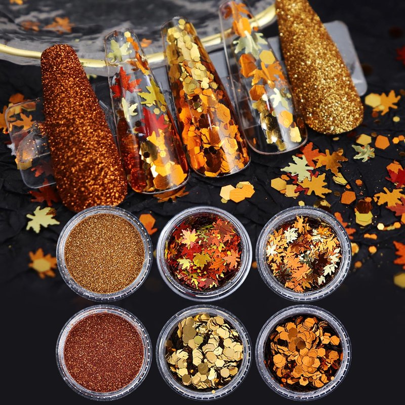 - 【Fall Glitter】-- You will get 4 grids glitter nail art sequins (maple leaf, hexagon) and 2 grids manicure fine glitter powder, design of mixed colors(golden orange, brick red).