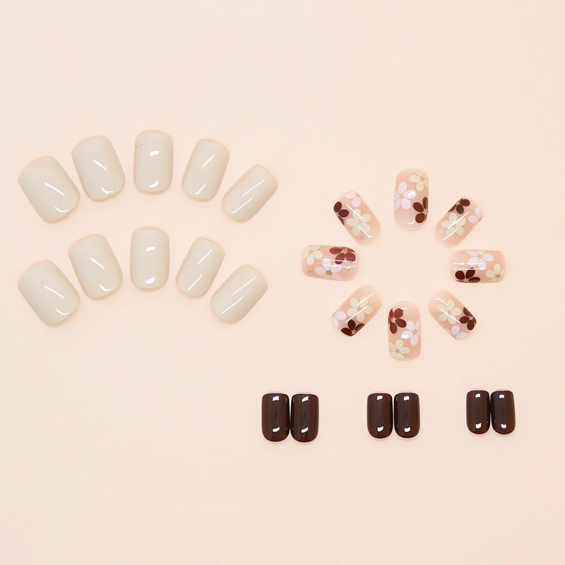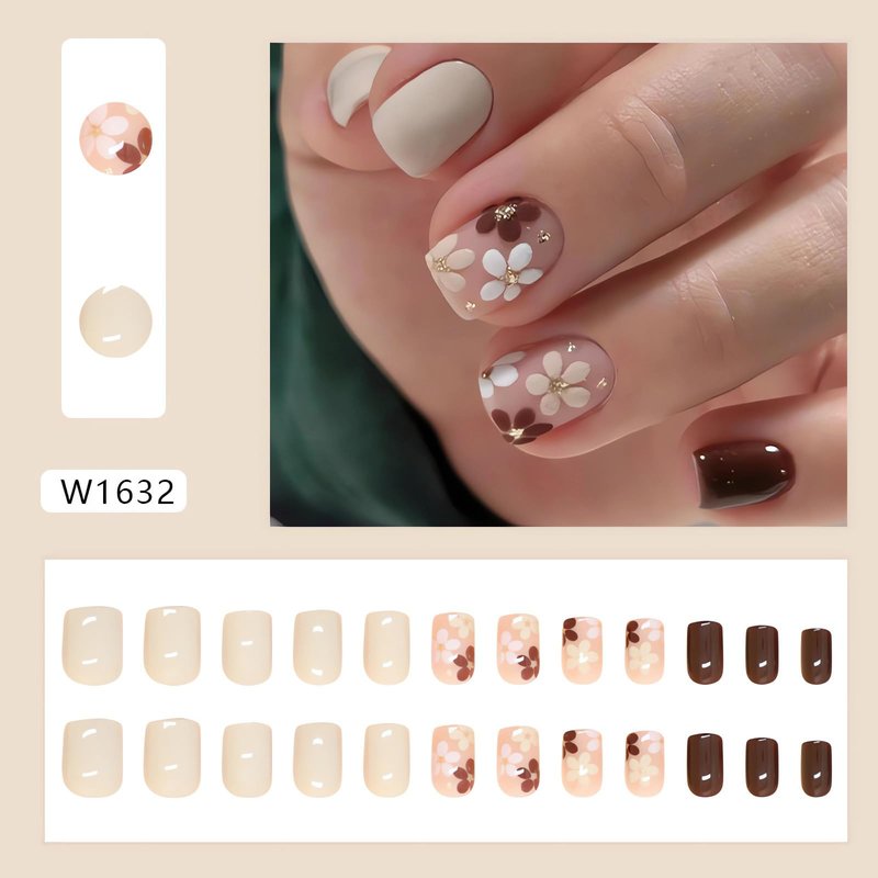 Fall Press on Nails Short Flowers Fake Nails - LPOODDNU Short Light Brown Flower Nails Press ons Square Shape Glue on Nails Full Cover Small Flowers False Nails Elegant Stick on Nails for Women 24Pcs