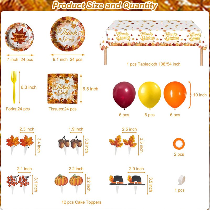 - Thanksgiving Party Supplies: You will receive 24 X 9 inch thanksgiving plates, 24 X 7 inch maple leaves plates, 24 pcs napkins, 24 pcs plastic forks, 1 pcs thanksgiving tablecloth, 18 X 10 inch balloons, 12 pcs cake toppers, 2 pcs ribbons, 1 pcs glue dots