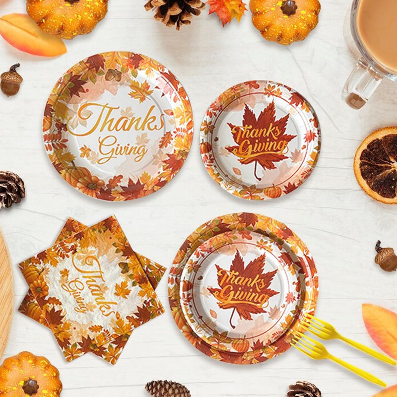 - Unique Thanksgiving Design: These fall party decorations supplies kit are designed specifically for the thanksgiving theme.The disposable thanksgiving party tableware feature maple leaves, fall fruits, pumpkin with etc fall elements, printed with "Thanksgiving" in unique lettering. Unique design creates a gorgeous atmosphere for thanksgiving party supplies dinnerware
