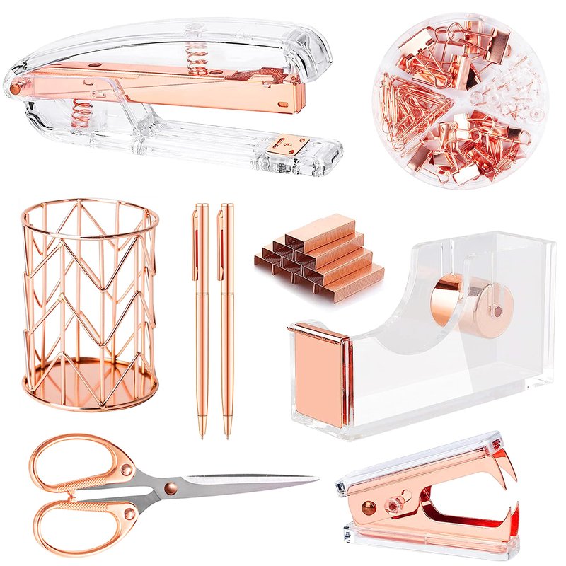 - Packing Listing: 1x stapler, 1x staple remover, 1000 x staples, 1 x tape holder, 1 x pen holder, 2 x pens, 1 xscissors and 1 x box of binder clips; This rose gold office supplies and accessories can meet your needs in daily life and work, keeping your desk or desk drawer organized.