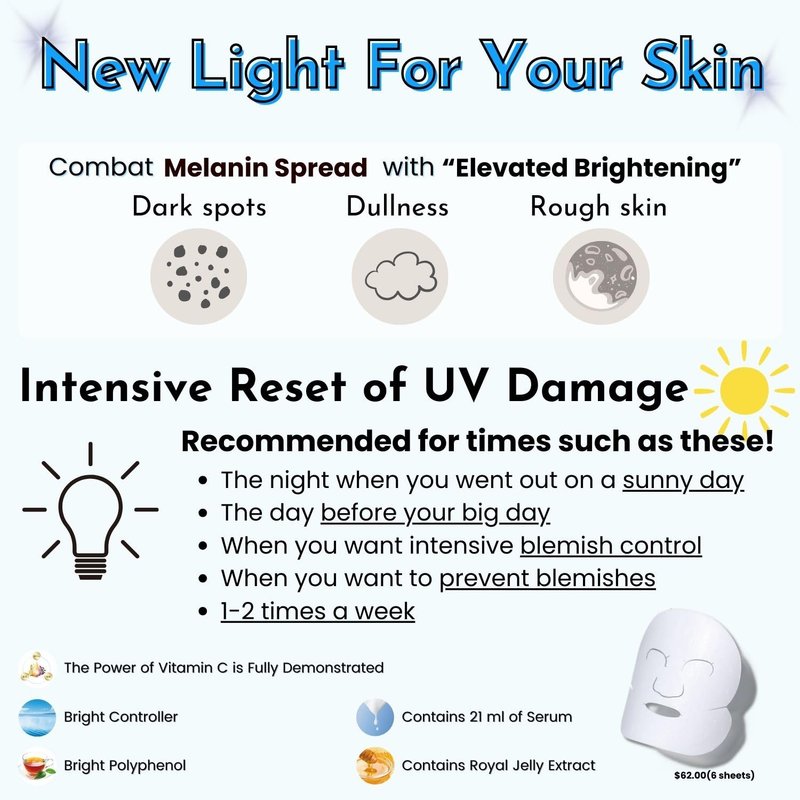 A brightening serum mask that targets melanocytes to prevent the root causes of dark spots. It cares for skin damage caused by UV-induced dryness, leaving your skin hydrated, smooth, and radiant with a translucent glow.