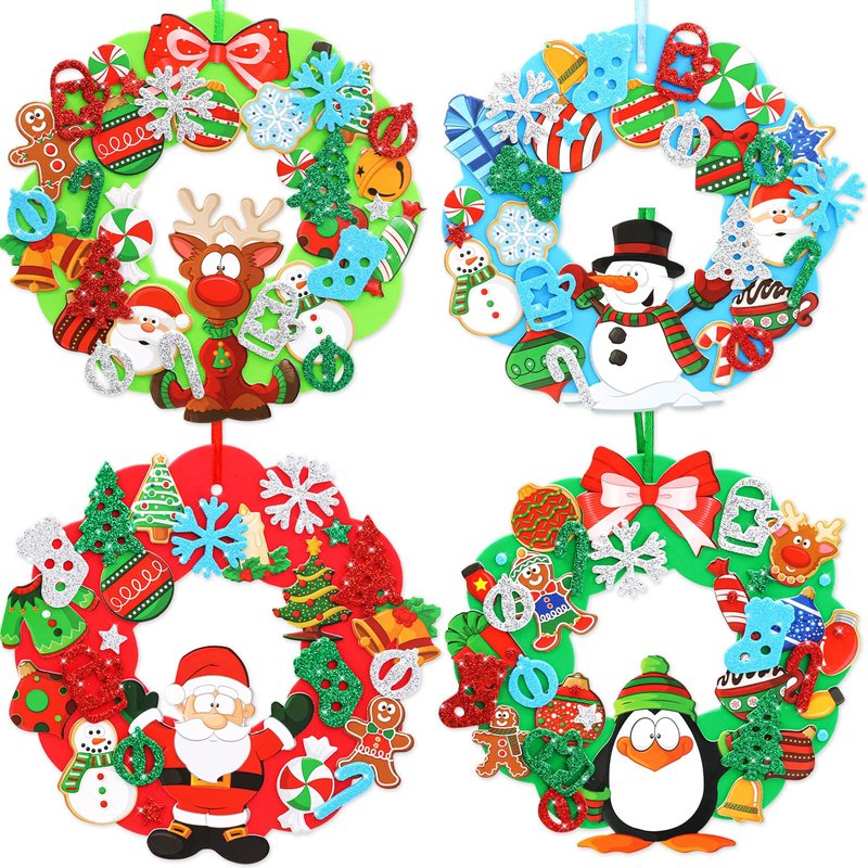 - Package Includes: 16 sets Christmas crafts for kids, including 16 foam wreath bases in 4 colors; 248 Christmas foam stickers; 200 Christmas glitter foam stickers in 4 colors; 16 satin cords