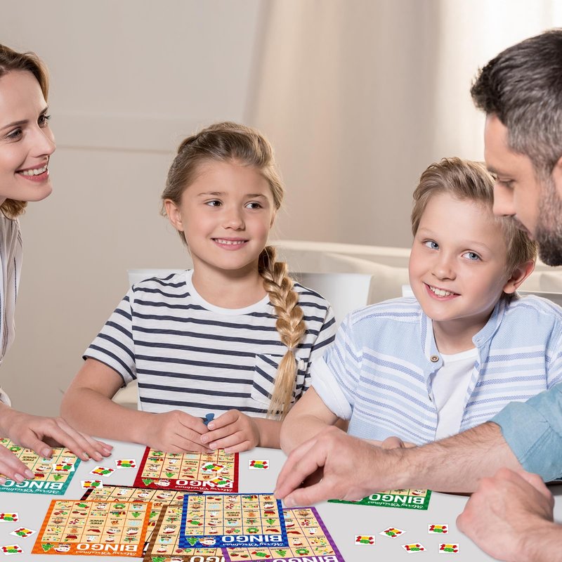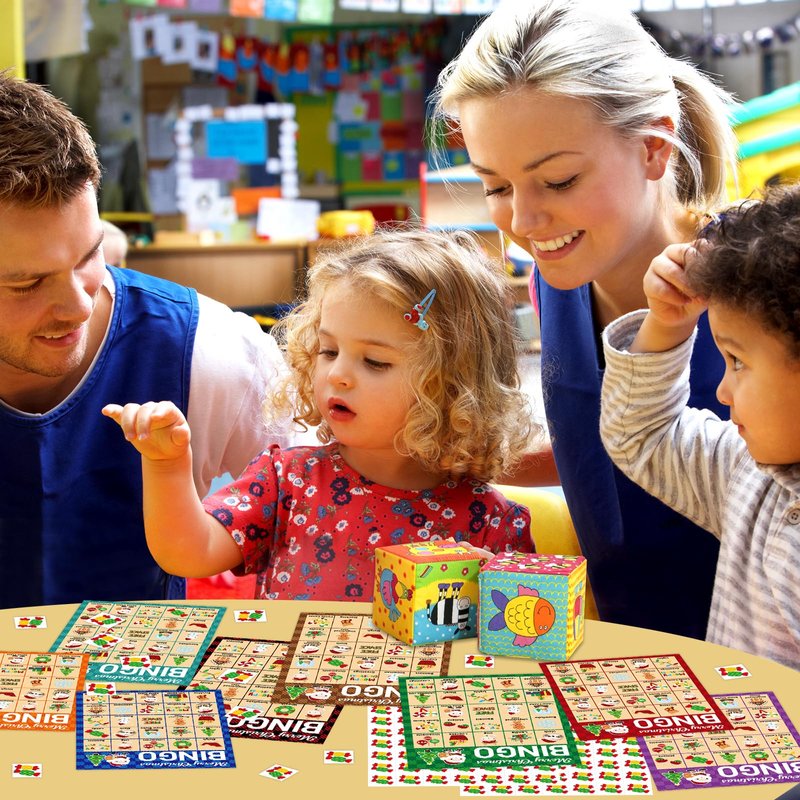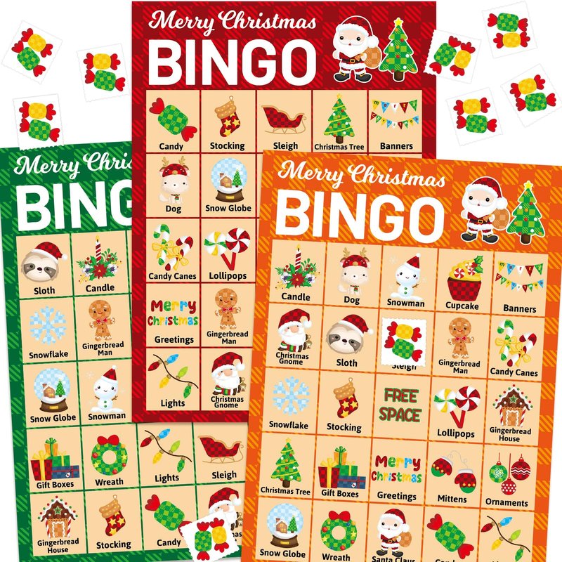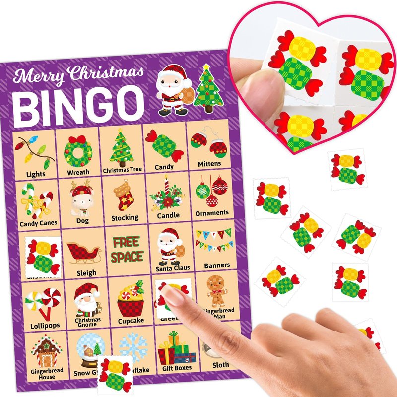 Package Includes: 24 Merry Christmas theme bingo cards, 441 candy bingo card chips, 24 call out cards; 7 x 5 inches player cards; Easily cut along dotted lines of chips sheets and calling card sheet Christmas Bingo Game for Kids: An easy game for kids to play; The holiday bingo game cards are full of favorite Christmas characters, such as Gingerbread men, Christmas trees, Santa Claus and so on; The plaid pattern is bright and colorful; They'll add a lot of fun to your Christmas parties Great Christmas Gifts: Our Christmas party game sets are available for both kids and adults; Great holiday gifts for families and friends; Perfect choice for Christmas party gathering Popular Board Game: Great interactive board game for school activities, classroom holiday parties, family winter parties and office Christmas games and more; Great Christmas gifts for kids and adults Our Advantages: Colorful printed; Thick paper cardstock; Reusable; Perforated design, easy to cut along dotted lines of chip sheets and caller card sheet; Well packaged in a box