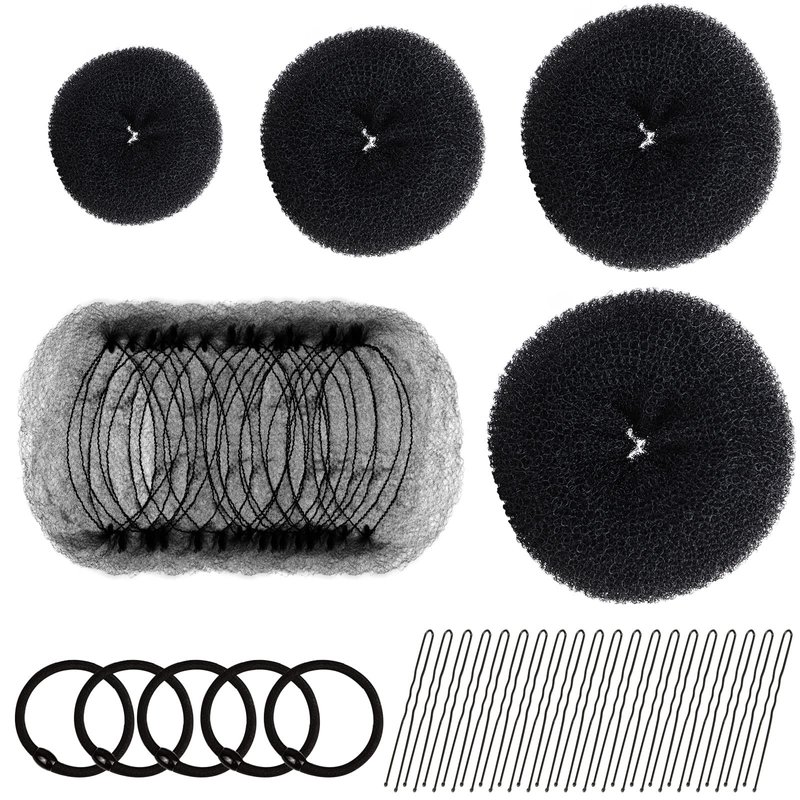 - Hair Bun Maker Tools Set: Comes with 4 different size hair donut bun( 1 Extra-large, 1 Large, 1 Medium and 1 Small), suitable for children and adults, thick or thin hair. 20pcs black invisible hair nets 20 inch(50cm), 20pcs black U shaped hair pins 2.4inch(6cm) and 5pcs hair elastic bands. You can get different types of hair bun hairstyles in a few minutes, quickly and easily.