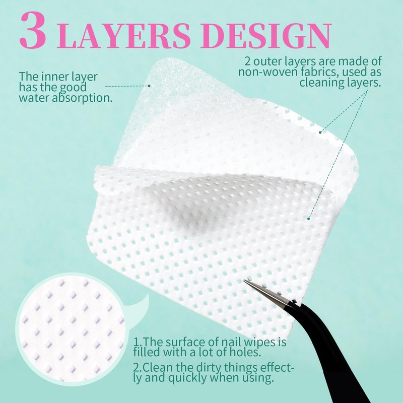- Great Using Effect--Thanks to the soft and flexible material, and the design of surface, which is filled with a lot of holes, it will clean the dirty things effectly and quickly when using. The Nail Lint Free wipes consist of 3 layers. 2 outer layers are used as cleaning layers, the inner layer work as water-absorbing sheet, so you could use it cleaning dry or wet things.