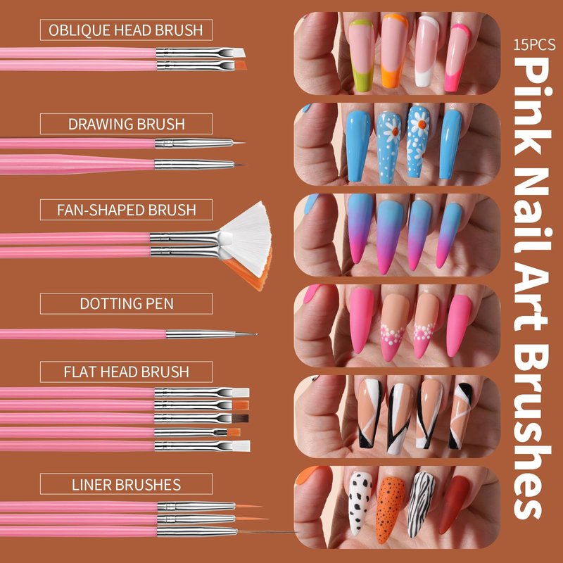 - Nail Design Tools: 15pcs nail art brushes includes flat head brushes, oblique head brushes, drawing brushes, liner brushes, fan shape brushes and doting brush for drawing thin lines, animal, flowers, leaves and all patterns you want. Dotting rhinestones and other nail decorations. Sweeping away excess glitter sequins. 5pcs nail dotting pen have the same size ball on one end and different sizes on the other for various sizes and patterns dotting and painting.