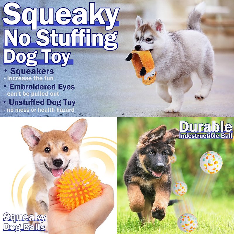- 【FUN DOG SQUEAKY TOYS】No stuffing squeaky dog toy and durable dog ball squeaky both have a built-in squeaker which is specially designed so that dogs won't squeeze it out. Squeaks can attract dog's attention, make them more focused during play, and attract puppy to chew and drag. Give dog mental stimulation, relieve boredom and release energy.