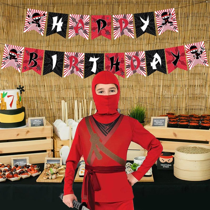 Fangleland Ninja Happy Birthday Banner for Boys Red Black Ninja Warrior Birthday Garland Anime Fans Theme Party Supplies