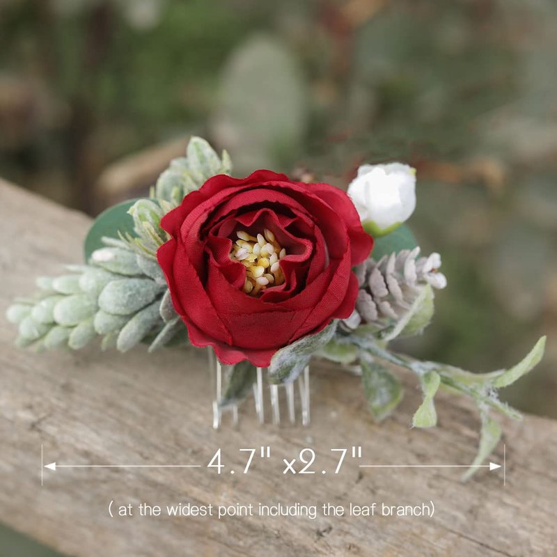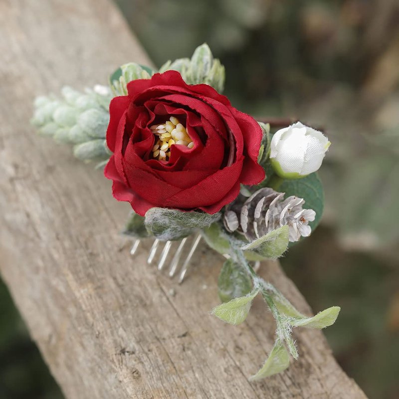 Fangsen Silver Wedding Red Rose Flower Hair Comb Boho Hair Accessory for Bridals