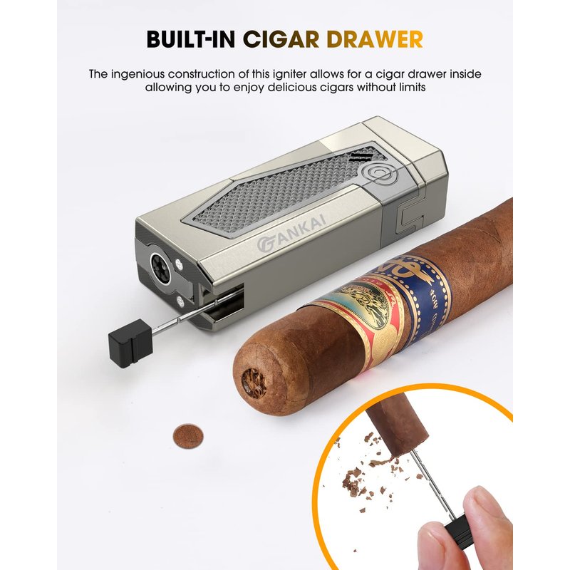 - [Foldable Cigar Punch] : The lighters for smoking built in a foldable cigar punch which diameter is 0.7 cm/0.27 inch at the bottom of the cigar lighter;with stainless steel sharp blade,you can get a clean and perfect cut everytime and fold it up after you use