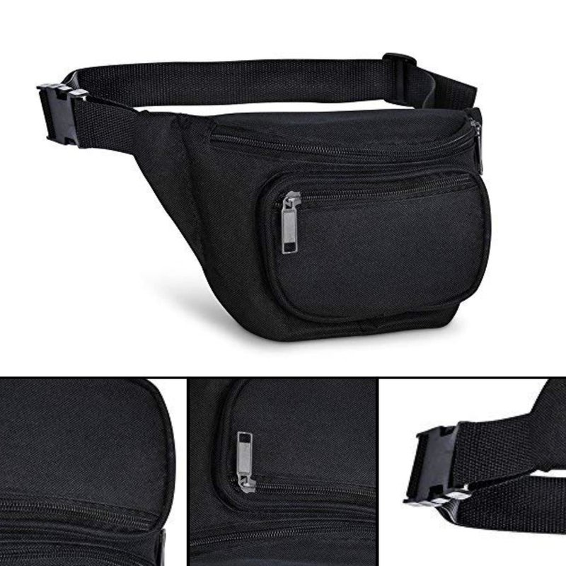Poly 600D durable fanny pack. Fanny pack features 3 separate zippered compartments. One main zippered compartment, one front zippered pocket, and a hidden zippered pocket on the back side. Hidden zippered pocket on the back side is great to store smart phone, money, and credit cards. Fanny pack has an adjustable waist strap fits up to 43” with quick release buckle. This waist bag is to make traveling fun and easy without having to carry a purse or a backpack.