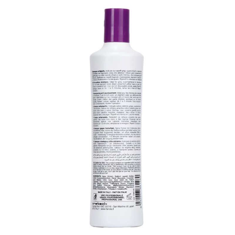 - How to Use - Apply Fanola Anti-Yellow Shampoo to wet hair and massage. Leave on for 1 to 5 minutes, lather and rinse thoroughly. For best results, follow with No Yellow Purple Mask toner as a system to ensure your ideal blonde tone by leaving it with a cold tone and a soft, shiny, silky texture. *Pro Tip: Can be used to pre-tone bleached hair or on super lightened hair, as well as on clients wanting less yellow tones
