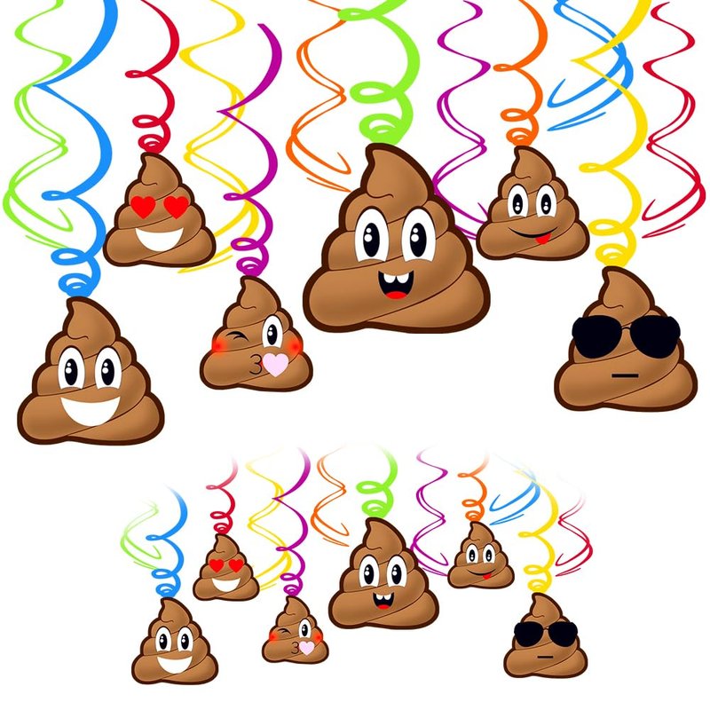 - Funny Party Decoration Swirls: This funny poop hanging swirls include 6 different emoji faces poops, kisses poop, love hearts eyes poop, smile faces poop, cool sunglasses poop, laugh poop, Stuck-Out Tongue poop; each design have 2 PCS card cut-outs. 6 different colors foil hanging swirls, each color have 2 PCS, enough for your indoor home ceiling decorations, wall porch decor.