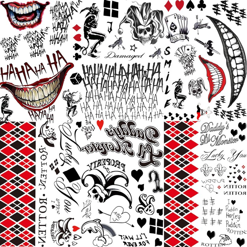 - 💖【6 Sheets 3D HQ Joker Temporary Tattoos For Men Adults Women Various Designs】FANRUI Brand Joker Tattoos For Adults Women. Package Includes 6 Sheets Joker Hands Tattoos Clown Halloween Costume Accessories Prison Rapper Ghost Prisoner Scary Smile Face Gothic Tattos Inmate Stickers Etc. Popular Fake Tattoos For Women Men Body Art And Add A Sense Of Fashion In Life.