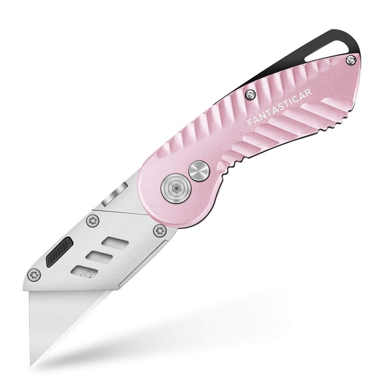 FantastiCAR Folding Utility Knife, Box Cutter Plume Type Metal Body, with Safety Lock and 5-Piece Extra Blades (Pink)