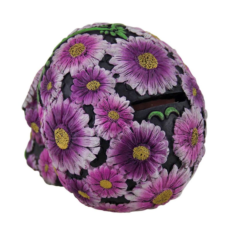 This floral sugar skull coin bank makes saving money fun and easy, and is a festive addition to shelves, desks, or bookcases in your home. This 5.25 inch long, 4.25 inch high, 3.75 inch wide (13x11x10 cm) sugar skull is creatively cast in resin and hand painted in a vibrant black, pink and purple finish, making each piece a lovely addition to any skull or coin bank collection. The bank easily empties via a rubber plug on the bottom. It's great as a gift any sugar skull lover is sure to enjoy!