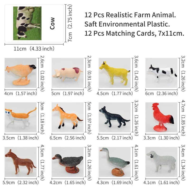 - VALUED ANIMAL PLAYSETS & CARDS: 12 assorted farm animals comes with an horse, sheep, cow, pig, hen, rooster, duck, goose, cat, dog, goat, donkey and 12 matching cards. Figures ranging from 2 inches to 3 inches according to the natural sizes of real animals.