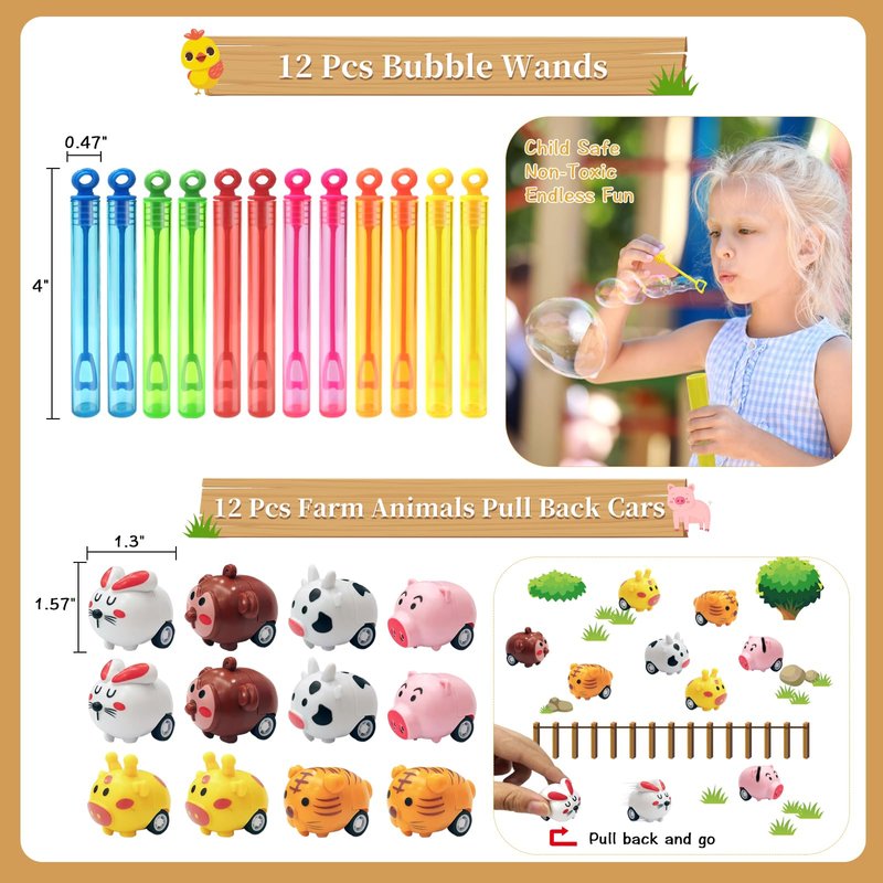 - [ALL-IN-ONE GOODIE BOXES] This ultimate farm party favors set includes everything you need to create an unforgettable farm-themed party. All items can be separately put in the box, serves 12 little ones. Both for creating surprise boxes for your guests to take home and handing out prizes during party games, this farm party favor set has you covered. Creates hours of fun and activity, suitable as a surprise for your family, buddies, classmates on any occasions, bringing them a lot of fun.