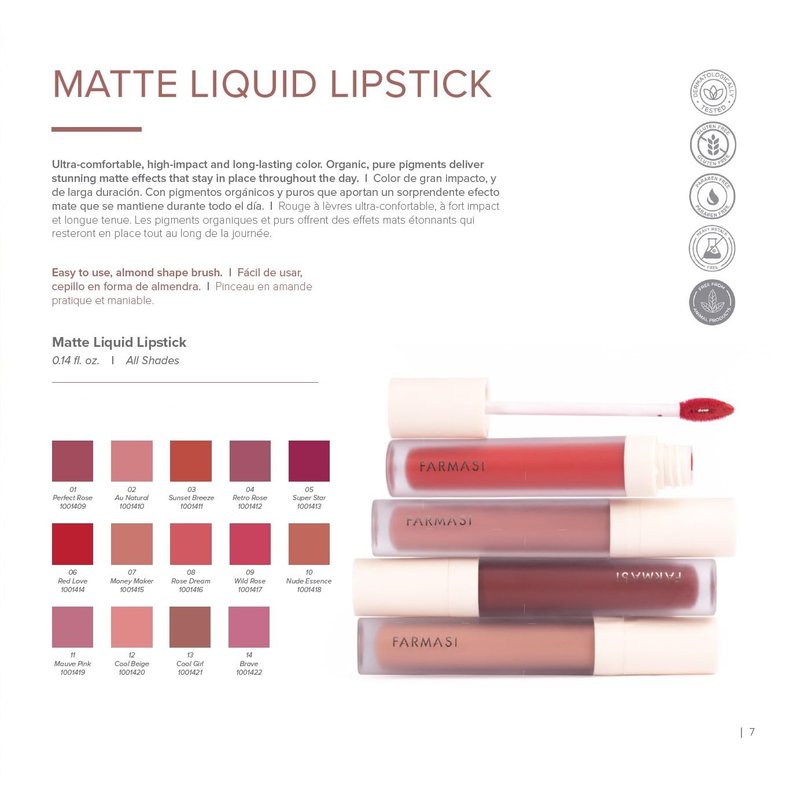 - Experience the ultimate in long-lasting, comfortable lip color with Farmasi Matte Liquid Lipstick. Our precision doe foot brush ensures mess-free application for all 12 wearable neutrals and buildable bolds. The formula is perfect for working overtime, parties, or any occasion where you need your lipstick to stay put.