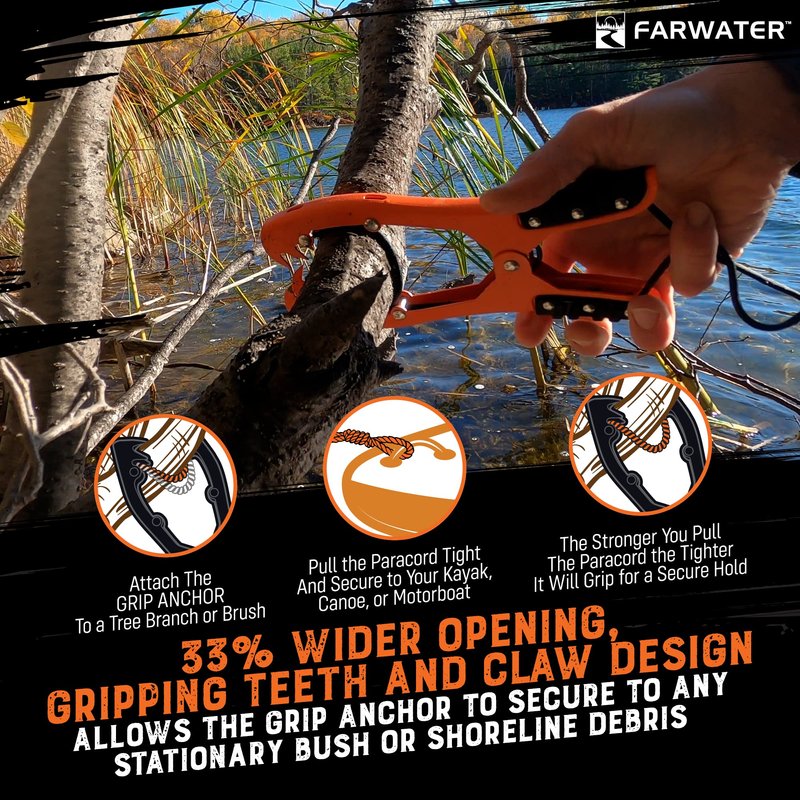 Need a fast, secure, and smart way of anchoring your boat or canoe You are out on your canoe or kayak soaking in the sights, feeling the cool breeze against your skin, waiting for a catch. You bring out your anchor and drop it in the water, but it creates a loud splash that scares away all the fish in the area. When it's time to leave, you pull your anchor up, only to find it firmly stuck in underwater debris. If only there was a faster and fuss-free way of securing your boat! Anchoring your boat is easy with the orange FARWATER Canoe Anchor Grip. Secure your kayak, canoe, boat, or float tube the smart way. With this anchor’s gripping teeth and claws, it’s designed to firmly clamp down on stationary objects, such as timber, shoreline brush, docking posts, or tree branches. This gripper uses a tension system that allows it to clamp down even harder when the paracord line is tugged. There's no need for you to drop large anchors into the water which could spook the fish or even damage their habitat. Forget about bringing heavy anchors all the time. Our anchor grip only weighs 8oz and is made of powder-coated steel that is protected against the formation of rust or corrosion. Need more time to decide Here are more reasons to equip yourself with this boat anchor grip: - Sturdy, non-slip rubber grips - Connected to a 15-ft. heavy-duty 550 paracord line - Wide opening, easy to attach and remove - Grips small brush or large branches - Perfect gift idea for boating, canoeing, duck hunting, or kayak fishing enthusiasts Now is the time for a boat anchor upgrade. Add the FARWATER Canoe Anchor Grip to your cart NOW!