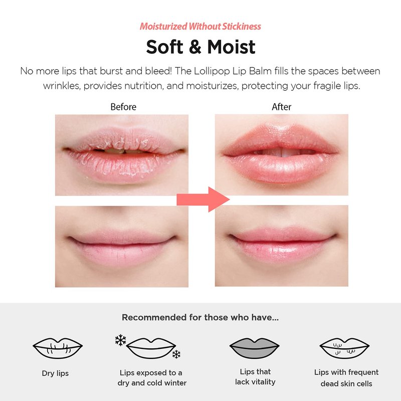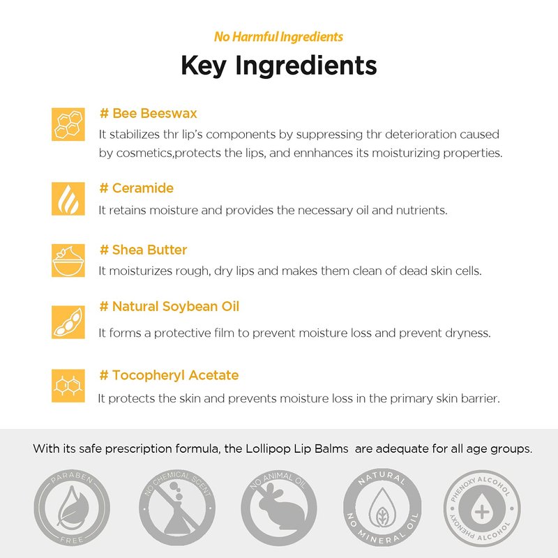 - Moisturize your lips with Beeswax: The Lollipop Korean Lip Balms are formulated with Beeswax, known for its excellent hydrating properties that lock moisture in your lips; as it’s mixed with Soybean Oil, its moisturizing impact is even more effective. The benefits of Beeswax extend to UV ray protection. A truly moisturizing and protective Korean lip balm.
