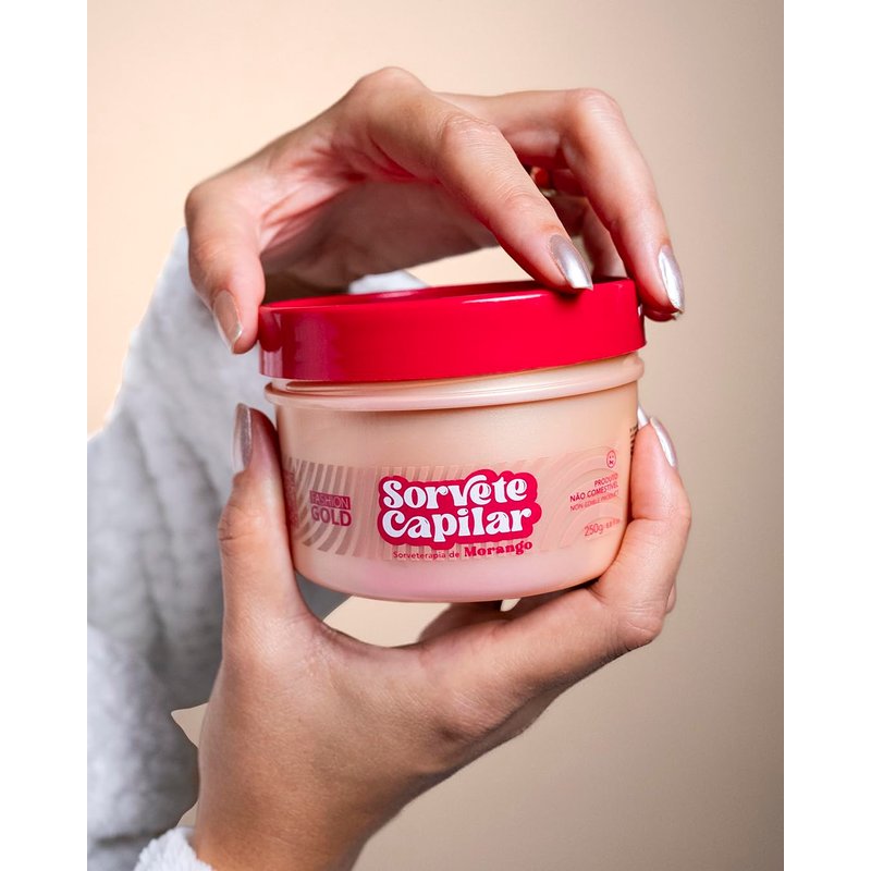 The line of Hair Sorbets is a revolution in hair care, delivering a unique and innovative experience for those looking for healthy, shiny and frizz-free hair. Inspired by the world of ice cream flavors, the Hair Sorbet line consists of three distinct creams, each representing the delicious flavors of Strawberry, Chocolate, and Vanilla. The standout of this line is the cold shock treatment. Each cream is formulated with advanced technology and high-quality ingredients that not only support but also optimize the benefits of the cold shock. This results in an unprecedented hair treatment characterized by the precise closing of the hair cuticle, effective control of elasticity of the strands and the reduction of frizz. Therefore, the Hair Sorbets is not a treatment like any other, but an experience that involves your senses in a world of freshness. Choose among the three flavors to adapt your treatment to the needs of your hair. With the Fashion Gold Hair Sorbet line, your hair will never be the same again. Experience the freshness and the benefits of these hair treatments and enjoy the extraordinary results they offer. Let your unique personality shine with confidence on any occasion knowing that you are giving your hair the treatment that it deserves. Be part of the hair care revolution with Hair Sorbets and discover a new dimension of beauty and hair wellness. Strawberry Ice Cream Therapy Strawberry Ice Cream Therapy is a luscious hair therapy. With Strawberry Frulix and Strawberry Extract, this formula resists low temperatures, allowing the ingredients to penetrate deeply to revitalize, nourish and strengthen the hair fiber. This attention to detail guarantees an effective nourishment in the hair’s cortex and significantly reduces frizz. Your hair will stay incredibly soft, strong and frizz-free. Benefits COLD SHOCK TREATMENT: The Hair Sorbets line offers an innovative hair treatment with cold shock, which helps with the precise closing of the hair cuticles, guaranteeing benefits such as frizz control, elasticity of the strands, and intense moisture. INTENSE MOISTURE: Each cream line, represented by flavors such as Strawberry, Chocolate, and Vanilla, offers intense moisture to the hair. This helps to keep the strands healthy and well nourished. FRIZZ CONTROL: The products in the Hair Sorbets line contribute to the significant reduction of frizz, leaving the hair smoother and healthier looking. LONG-LASTING SHINE: With ingredients that are technologically adapted to support low temperatures, the Hair Sorbets line intensifies the shine of the hair giving it a radiant appearance. HAIR REVITALIZATION: The ingredients present in the formula revitalize the hair, making it softer, shinier, and full of life. PROTECTION AGAINST COLD: Thanks to their resistance to low temperatures, these products are ideal for cold environments and help to protect the hair from damage related to the climate. Mechanism of Action The mechanism of action of the Hair Sorbets is based on the treatment with cold shock. When applied to the hair, this product works to promote the precise closing of the hair cuticles. Closing the cuticles is essential for controlling the elasticity of the strands, reducing frizz and providing intense moisture, which results in healthier hair with a long-lasting shine. Furthermore, its technologically adapted formula is created to resist low temperatures, which optimizes the effectiveness of the treatment, even in cold environments. Thus, the Hair Sorbets work to provide an unprecedented hair treatment, that not only refreshes, but also revitalizes and strengthens the hair, keeping it healthy and beautiful. Mode of Use 01 After washing the hair with your shampoo of choice, take the Hair Sorbet out of the freezer. 02 Use a spatula to apply the Hair Sorbet on the hair. 03 Use a comb to distribute the product evenly. Make sure to not use gloves when applying it, to avoid warming the product. 04 Leave the Hair Sorbet on the hair until it reaches room temperature. 05 Rinse. Ingredients: VANILLA MILK: As the main ingredient of Vanilla Ice Cream Therapy, it is a valuable source of antioxidants that protects the strands against damage from free radicals, strengthening the hair structure. Furthermore, it intensifies shine, delivering concentrated moisture and frizz control. Its ability to nourish and revitalize the hair results in hair that has a luminous, healthy, and smooth appearance, even in challenging climatic conditions. LAMINARIA LATISSIMA (SUGAR KELP): Sugar Kelp, a fundamental ingredient in the Fashion Gold Hair Sorbet line, is a variety of notable marine algae, found in the frigid waters of the North Atlantic. What makes this alga so special is its incredible ability to prosper in extreme cold, resisting temperatures that frequently fall below zero. This adaptive quality not only makes it unique, but it also provides a series of exceptional benefits for hair treatment, especially when incorporated in a line like Hair Sorbets. Sugar Kelp is a master of adaptation. When confronted with frigid temperatures, this alga adjusts its metabolic activity to synthesize new molecules. This process is an extraordinary response to climatic adversity, allowing the alga not only to survive, but also to prosper. What is truly noteworthy is that these new synthesized molecules have important properties for the hair. They contribute to the revitalization and strengthening of the strands, helping to combat the damage caused by different factors, including exposure to extremely low temperatures. In addition to the benefits for hair renewal, Sugar Kelp algae play an essential role in maintaining the formula of cosmetic products in environments with low temperatures. Its unique ability to adapt is not limited to just synthesizing molecules beneficial for the hair, but it also contributes to the stability and preservation of other ingredients present in products’ formulas. This quality makes Sugar Kelp algae