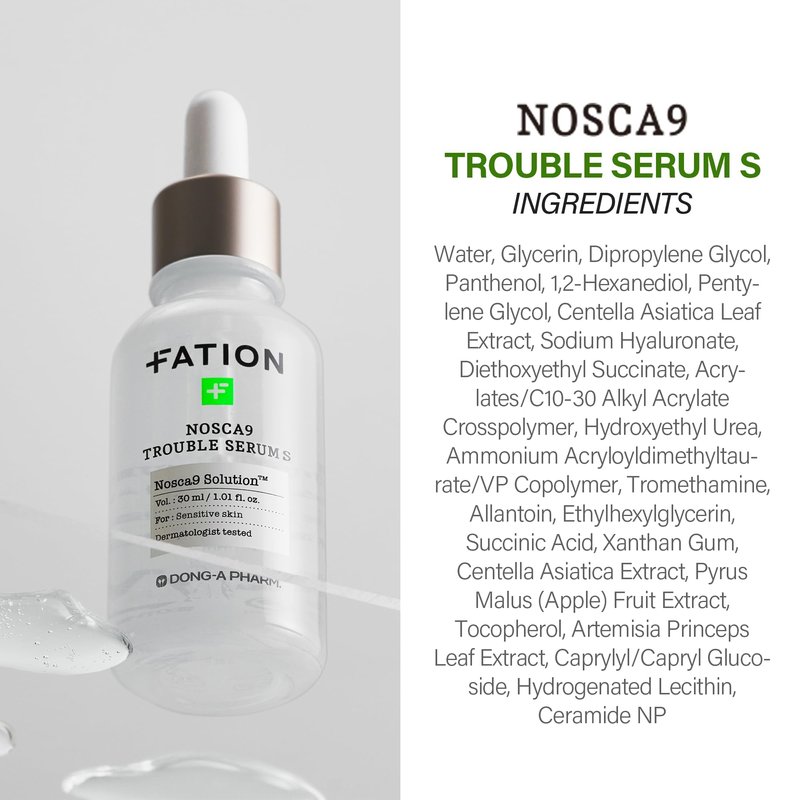 - 💧 DEEP HYDRATION MAGIC. Elevate your skin's hydration levels with FATION NOSCA9 Trouble Serum S, a specially formulated hydrating serum for face. This face serum is enriched with 46% Centella Asiatica extract and 3% Panthenol to ensure deep moisture without heaviness.