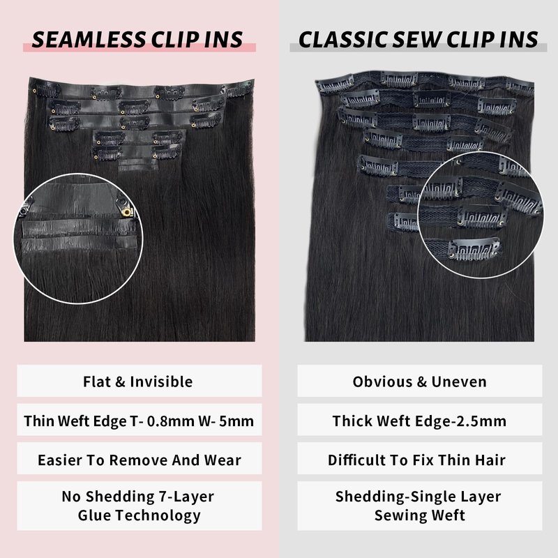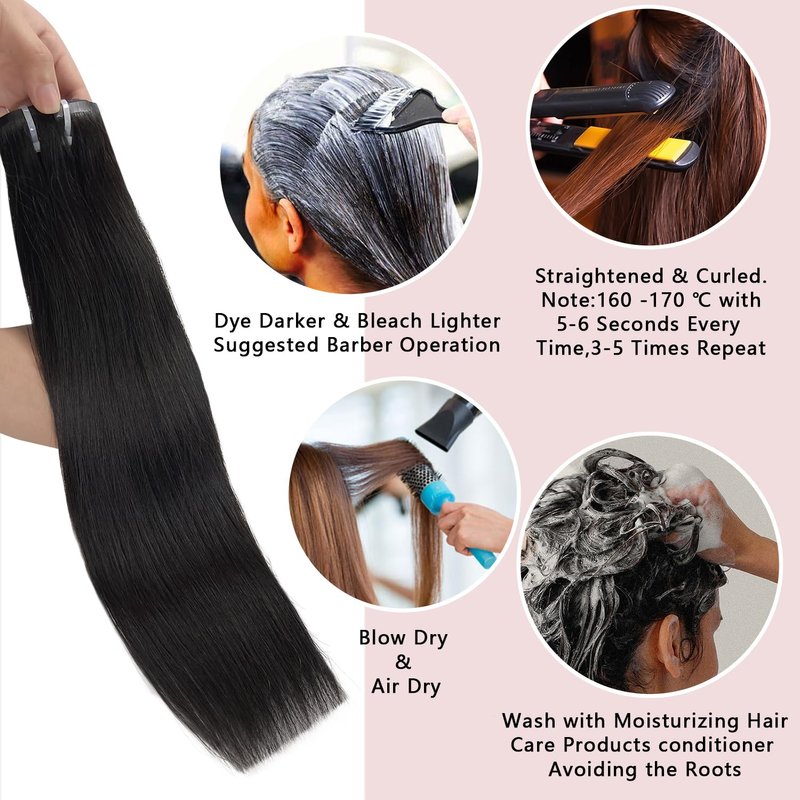 💈Our black seamless clip-in human hair extensions are made from high-quality 100% Remy human hair, which can be styled with heat tools, washed, and dyed to match your natural hair color. They have a seamless design that blends flawlessly with your hair, and are easy to apply and remove without damaging your natural hair. Our clip-in extensions are also versatile and can be cut and styled to create any hairstyle you desire.