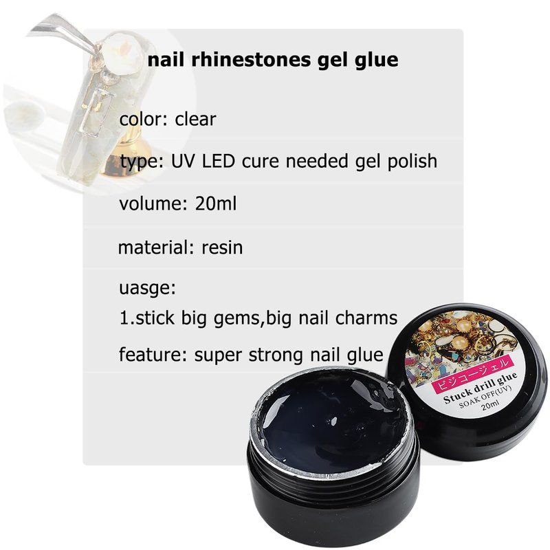 - 【20ml Super strong nail glue】 This rhinestone gel glue is super sticky. It’s suitable for big nail charms,big nail diamonds,and other big size 3D nail decoration. The nail stones will last for more than 2 weeks.