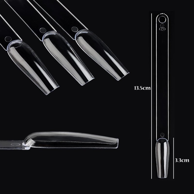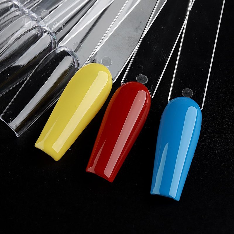 Specification: Fan shaped design,easy to carry and display the color and nail design. Ideal for Manicure Item: Nail Swatches Set Colors: Transparent Shape: Ballerina Design: With Metal Ring Quantity: 50 Tips/set, 3 sets/pack Usage: Nail Sample Display Gel Polish Palette Gel Polish Color Chart Package Content: 150pcs of Nail Art Display