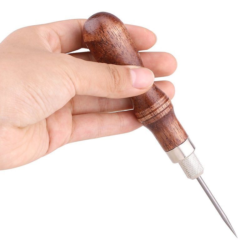 - The stitching awl is made from hardened metal and has a wooden handle
