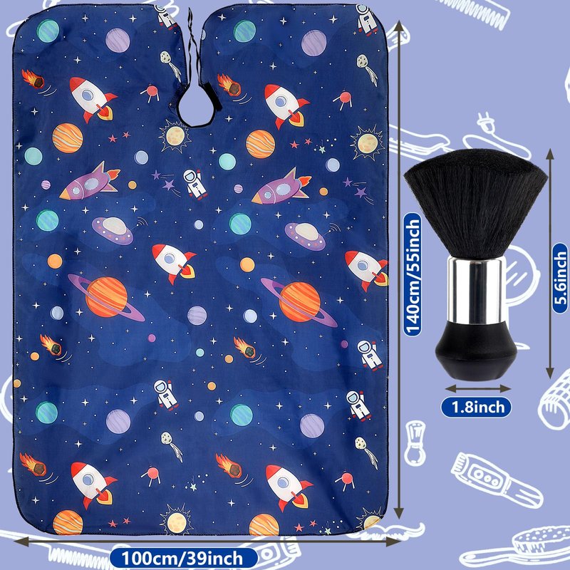 Package includes: 1 x Hair cutting cape 1 x Neck duster brush Salon cape size: 55x39 inches Color: Dark Blue Pattern:Space, astronaut,planet,rocket The hair cutting cape for kids with adjustable cape neckline,which is easy to clean and use,ideal for shampoo, cutting and styling. great for professional hair and salon or home use. Notes: Manual measurement, please allow slight errors on size. The color may exist a slight difference due to different screen displays.