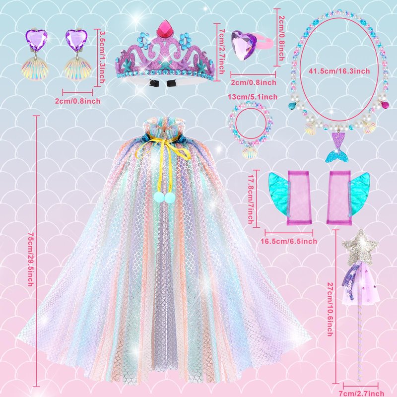 - Stylish and Colorful Mermaid Cape for Girls: Colorful dress up cape made of soft and comfy sheer mesh fabric with pretty mermaid pattern details. Durable and lightweight toddler princess dress up cape with gorgeous matching accessories, adding extra charm to dress up play for girl.