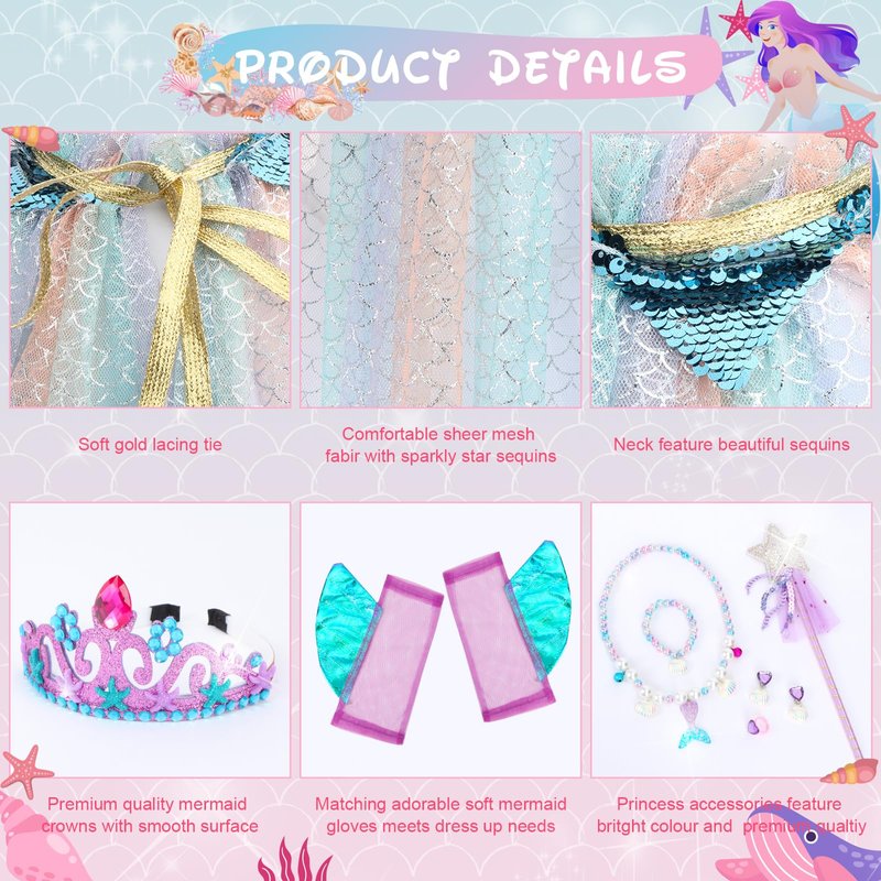- Princess Mermaid Costume set for Girls: Dress up as a pretty little mermaid with our mermaid princess dress up set. It comes with colorful mermaid princess cape, mermaid glove, princess crown tiara and matching princess accessories. A must have princess dress up accessories set for little girl to complete their getup.