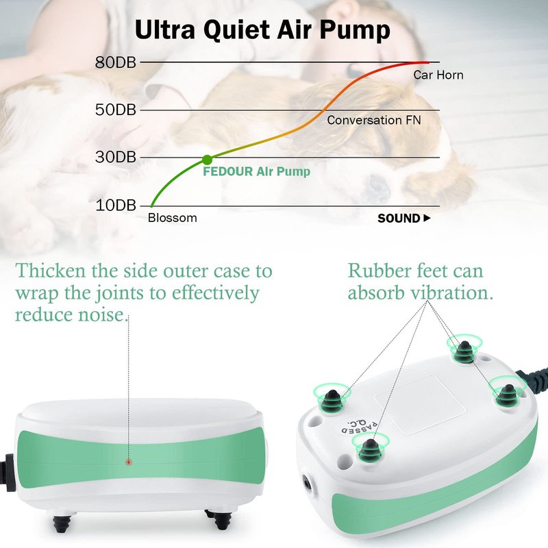 - Ultra Quiet: Made of ABS thickening engineering plastics, super silent aquarium air pump. Soft rubber foot pads, further palliation for noise.