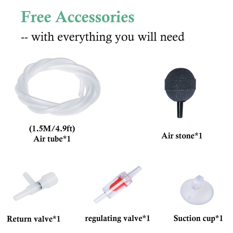 - Complete Accessories: Comes with everything you need, includes: 1x Air Pump, 1x User Manual, 1x Air Hose, 1x Air Stone, 1x Return Valve, 1x Regulating Valve, 1x Suction Cup, 1x Air Filter Cotton. Original quality, professional manufacturer.