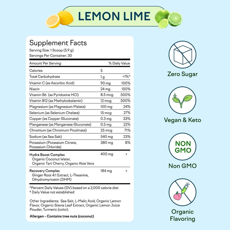 Feel Goods Hydration Hero, 1,000mg Electrolytes Powder, Sugar Free, Magnesium, Organic Coconut Water, Organic Aloe, L Theanine, Vitamin C & B12, Non GMO, Keto, Vegan | Lemon Lime, 30 Servings