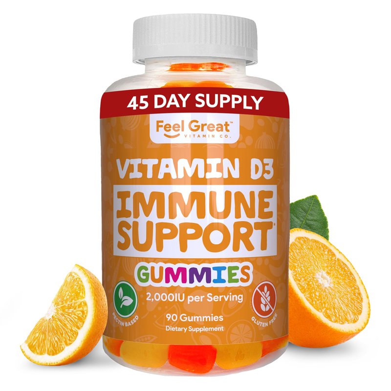 Supplement your daily Vitamin D needs with a soft, chewable gummy designed to help your famliy get the most out of the foods, fruit, and vegetables. Vitamin D is one of the most vital nutrients for your body. It helps process calcium and phosphorus more efficiently and effectively, which play a critical role in building strong teeth, bones, and immune system health*. But keeping out in the sun or relying solely on foods comes with its own unique challenges. That’s why we created Feel Great Vitamin Co. D3 Gummies to provide all the additional support you'll need to absorb those vitamins and minerals more effectively, so you can be at their best both inside and out. A smart, easy way to get you excited about taking vitamins, these soft chewables come in three great flavors that help you stay healthy and be active. Product Details: Vitamin D3 for Men & Women Fun, Chewable Gummies Orange, Peach, and Strawberry Flavors Daily Dietary Supplement Volume: 90 Gummies Crafted in GMP-Certified Facility Gluten Free and Made in the USA Allergy Warning: Does contain tree nuts. Give yourself a healthy dose of sunshine with chewable Vitamin D3 gummies that help the body absorb more calcium for strong teeth, bones, and immune system health.*