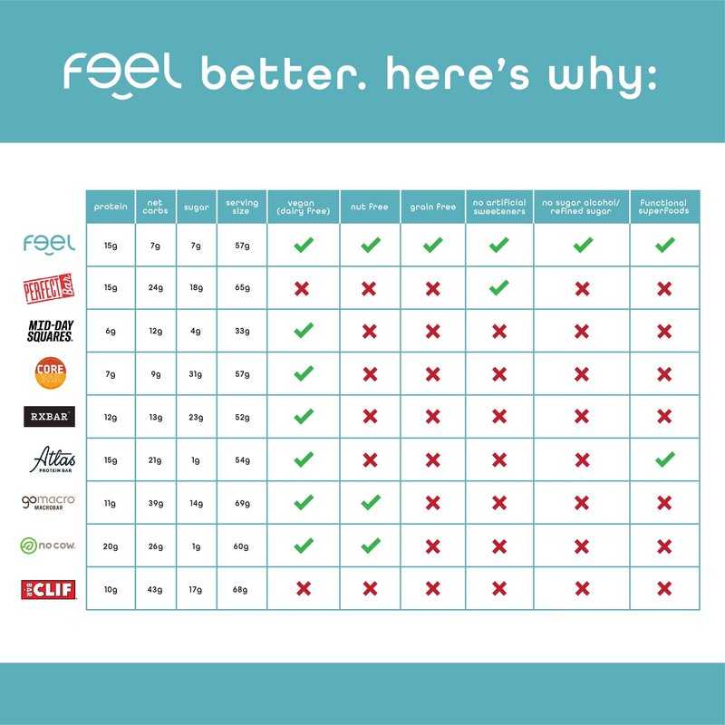 - CONVENIENCE ON-THE-GO: Need a convenient snack that can help you curb your appetite until your next meal? Stash an individual or even a 10-pack of Feel Bar protein bars in your car, office or travel bag for a sweet snack or breakfast on the go.